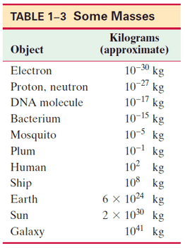 This is Giancoli Answers with Mr. Dychko. Protons and neutrons are both nucleons and so we can see from that table 1–3 that a proton or a neutron or collectively you can refer to them as nucleons; one nucleon has a mass of 10 to the negative 27 kilograms and we multiply that by 10 to the minus 15 kilograms per bacterium and then I'm gonna multiply it by a half because there's about approximately 1 proton for every 2 nucleons because most atoms have as many neutrons as they have protons and you can check that on Wikipedia, there's neutron-proton ratio. So for most elements up to about element number 20, they have a neutron to proton ratio of about 1 so there are as many neutrons as protons and most mass in universe consists of light elements because the heavier elements are created only in large supernovae or large stellar events that are uncommon compared to the more common events that make these lighter elements so most mass has a ratio of 1 proton for every 1 neutron. So that means for every 2 nucleons that you are considering, one of them is gonna be a proton. So we multiply this result here by half and we get 10 to the 15 protons per bacterium. And for DNA, it's the same calculation but you have 10 to the negative 17 kilograms for every DNA and we get 5 times 10 to the 9 protons per DNA molecule and then 1 nucleon for every 10 to the minus 27 kilograms times 10 to the 2 kilograms per human approximately times 1 proton for every 2 nucleons gives 5 times 10 to the 28 protons per human. And then both of these conversion or factors multiplied by 10 to the 41 kilograms per galaxy gives us 5 times 10 to the 67 protons per galaxy and then here is a calculator showing you those calculations.