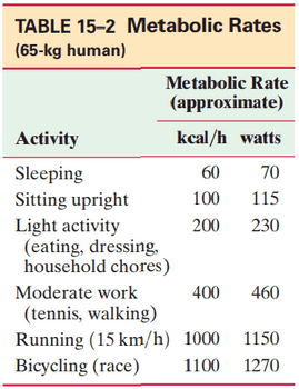 This is Giancoli Answers with Mister Dychko. So, running at about 15 kilometers an hour has a metabolic rate of 1150 watts or joules per second. If you do that 30 minutes per day, multiply that by 60 seconds per minute, the minutes cancel and then the seconds cancel and we end up with the number of joules burned per day. Multiply that by seven days per week and the days cancel and we get the number of joules burned per week. That's about 1.4 times ten to the seven joules. The number of food calories, well, we convert the joules by multiplying by one calorie for every 4.186 times ten to the three joules, and that's about 3500 food calories.
